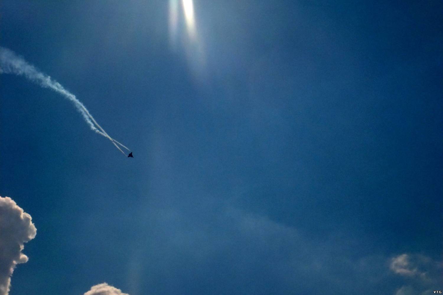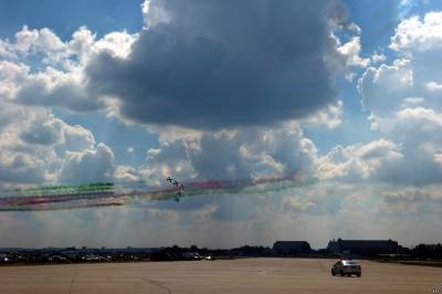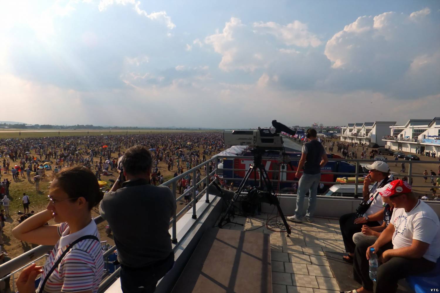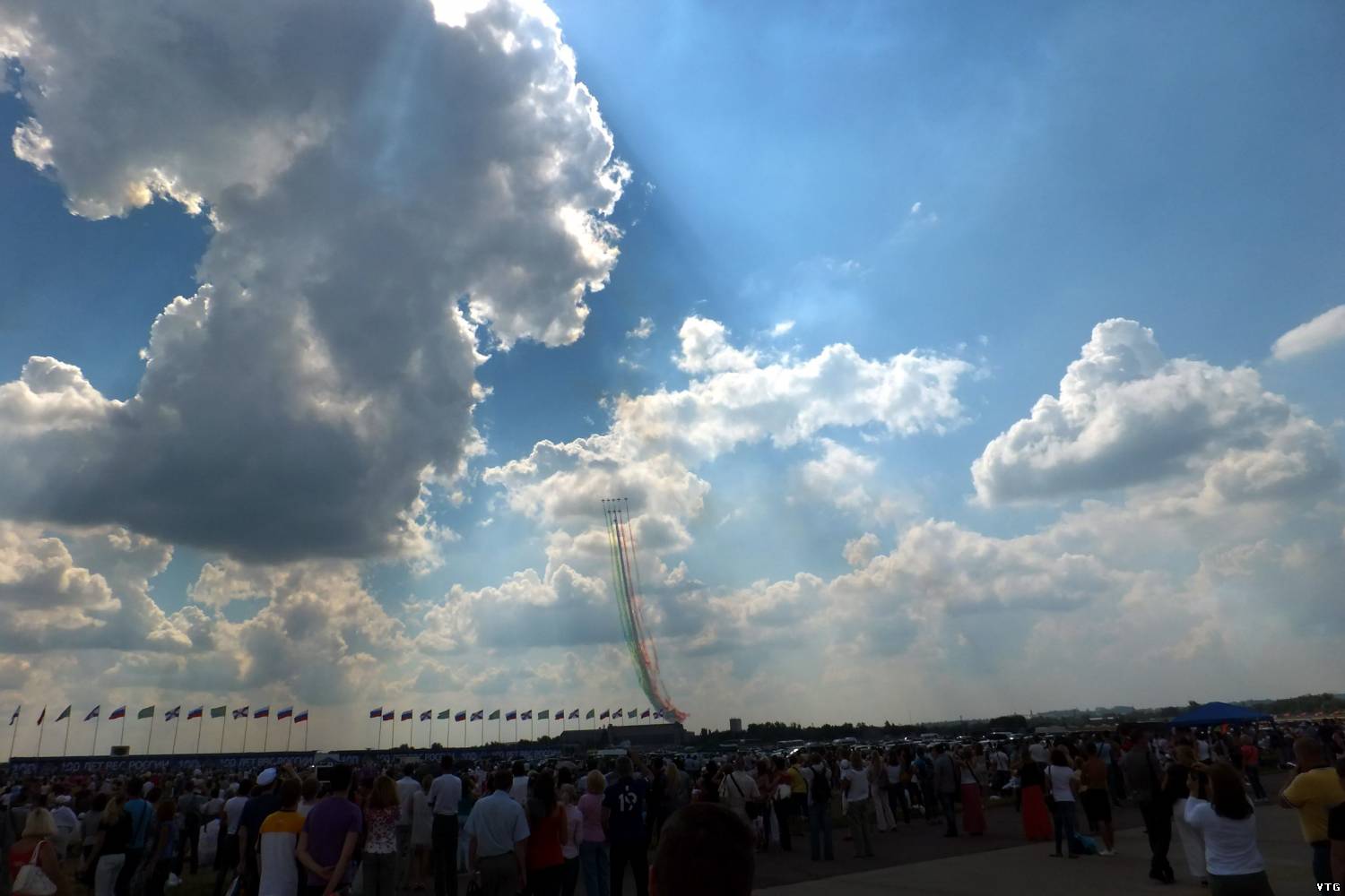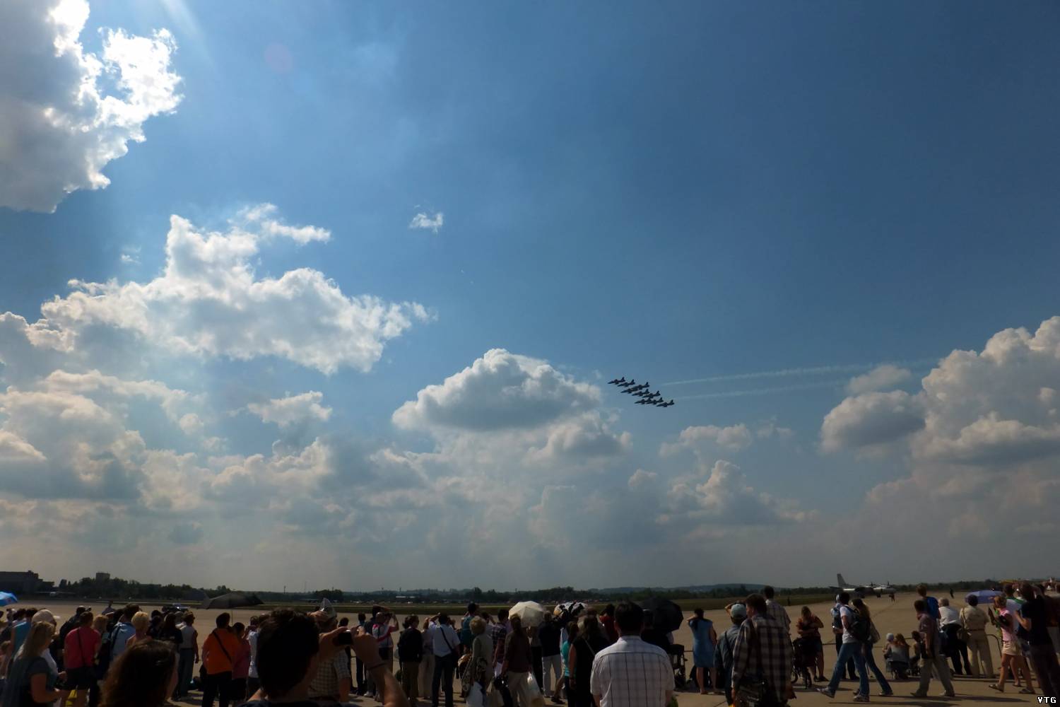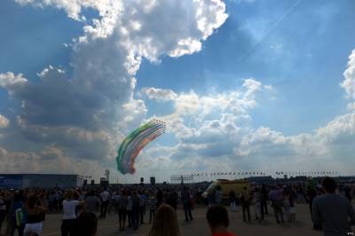 12 числа с погодой повезло и мы спонтанно собравшись рванули на шоу. Организация была на высшем уровне . Бесплатные автобусы беспрерывно доставляли гостей шоу к аэродрому . На территории аэродрома было много точек для принятия пищи . Продавалась вода, пиво . Так же велась продажа разнообразных сувениров начиная с авторучек с флажками и заканчивая посудой с символикой и одеждой летчиков . Я сделал несколько снимков , но сразу хочу предупредить , что снимки не достаточного качества , так как наблюдая за полётами приходилось смотреть против солнца.